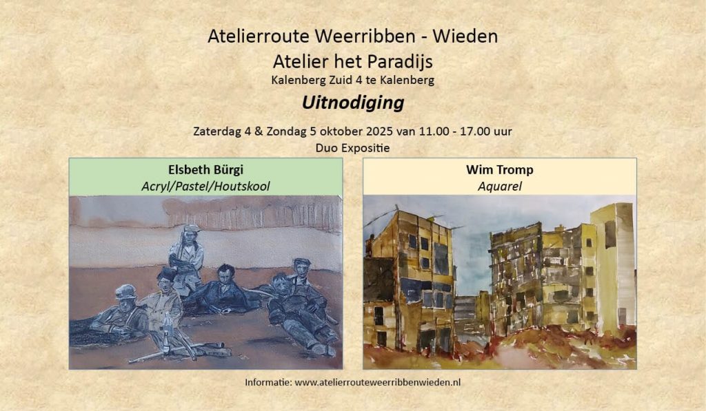 Meer info: https://atelierrouteweerribbenwieden.nl/deelnemer/wim-tromp/ en https://atelierrouteweerribbenwieden.nl/deelnemer/elsbeth-burgi/